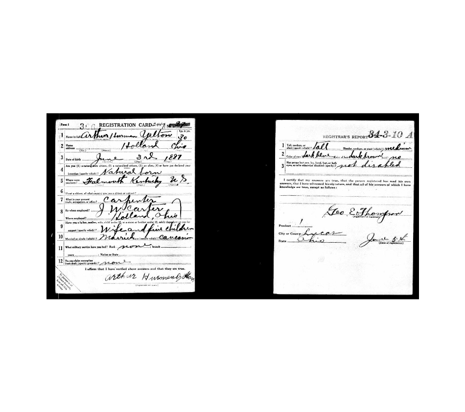 In 1917, Arthur registers for the draft in Lucas County, Ohio along with all other eligible men, nearly 23% of the nation’s population between all states. He is listed as a carpenter, with a wife and at least a single child. He is described as tall, of medium build, with dark blue eyes and dark brown hair. Although his occupation and status would have given him a reason to avoid the draft, he did not claim exemption.