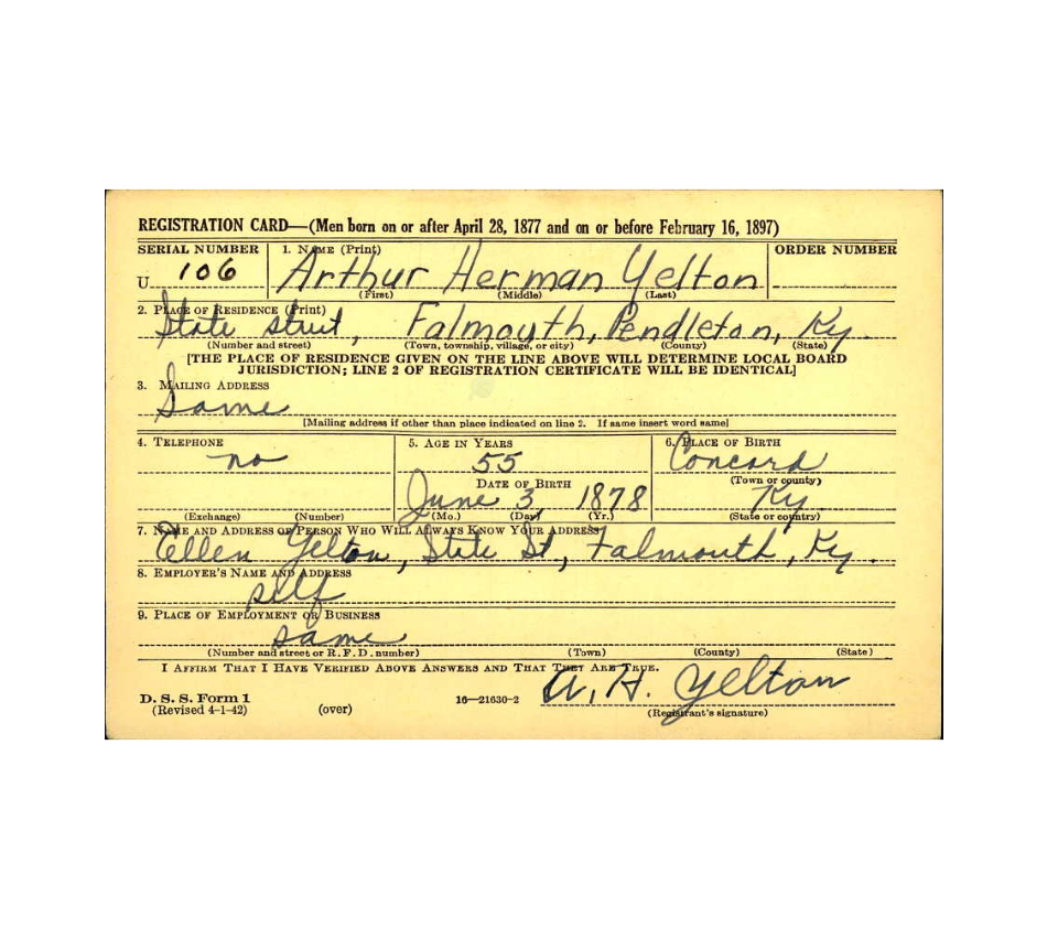 Arthur has once again switched professions by 1940, listed as a lumber mill worker making $600 a year. At age 52, he lives on State Street in Falmouth with his seven kids, aged 24 to 7. His oldest daughter Millie works as a maid in a private home while his youngest kids attend school. The highest grade Arthur attained was sixth grade. Falmouth is slowly starting to modernize around the Yelton family. It is likely that the town would have had a hardware store, a grocery, and a bank; big time-metropolitan to the cotton farm. rationing was beginning to take effect, limiting the amount of gas, sugar, and tires available to the people of Falmouth. In 1942, Arthur again registers for a World War. he is listed as 6’1”, with blue eyes and gray hair and “sallow” complexion. He weighs 160 pounds and his left hand is noted as “first finger disfigured”.
